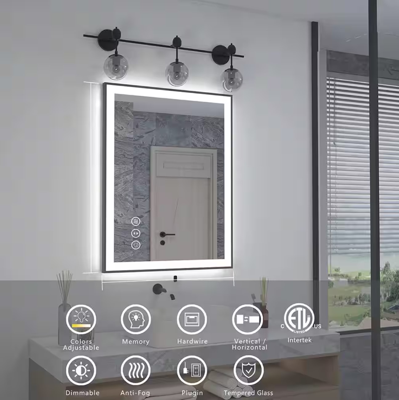 Featuring a bold black border, the mirror delivers a sophisticated, contemporary look that complements a wide range of interior styles—from ultra-modern to industrial chic. Its surface is made of high-quality tempered glass, offering exceptional clarity, crisp reflection, and durability. The frontlit LED lighting provides bright, task-focused illumination, ideal for makeup application, shaving, grooming, or skincare.